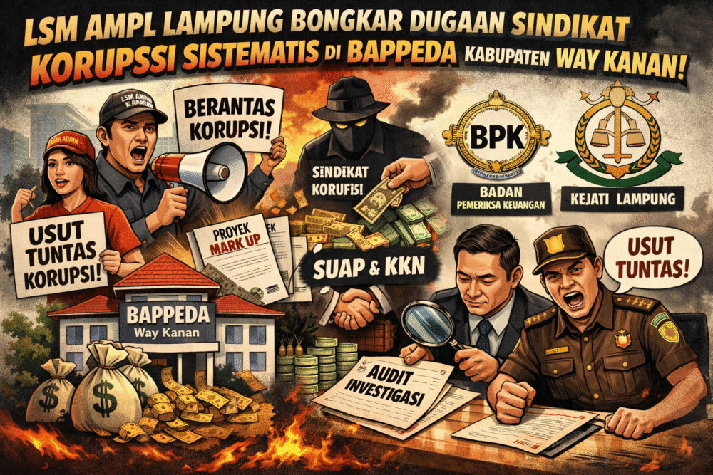 BANDAR LAMPUNG — LSM Aspirasi Masyarakat Peduli Lampung (AMPL) Provinsi Lampung mengungkap dugaan praktik korupsi, kolusi, dan nepotisme (KKN) yang disebut terjadi secara terstruktur, sistematis, dan masif di lingkungan Badan Perencanaan Pembangunan Daerah (Bappeda) Kabupaten Way Kanan. Dugaan ini didasarkan atas hasil investigasi dan pengumpulan data lapangan yang dilakukan lembaga tersebut terhadap realisasi anggaran Tahun Anggaran (TA) 2024. LSM AMPL mendesak Badan Pemeriksa Keuangan (BPK) RI Perwakilan Lampung dan Kejaksaan Tinggi (Kejati) Lampung untuk segera turun tangan.