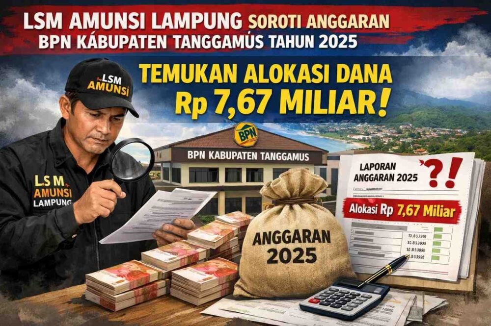 Tanggamus – Lembaga Swadaya Masyarakat (LSM) Amunsi Provinsi Lampung menyoroti tajam pengelolaan anggaran Kantor Pertanahan (ATR/BPN) Kabupaten Tanggamus Tahun Anggaran 2025. Berdasarkan data resmi yang diperoleh dari DIPA Petikan Tahun 2025, institusi tersebut tercatat mengelola anggaran sebesar Rp7.672.790.000 (tujuh miliar enam ratus tujuh puluh dua juta tujuh ratus sembilan puluh ribu rupiah).